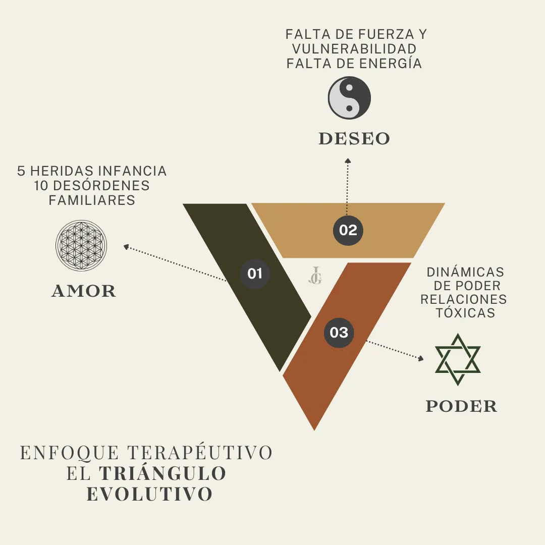 He desarrollado un método después de todos estos años de investigación, que resume la capacidad de crecimiento y de sanacion en tres aspectos, que he llamado el Triángulo Evolutivo.